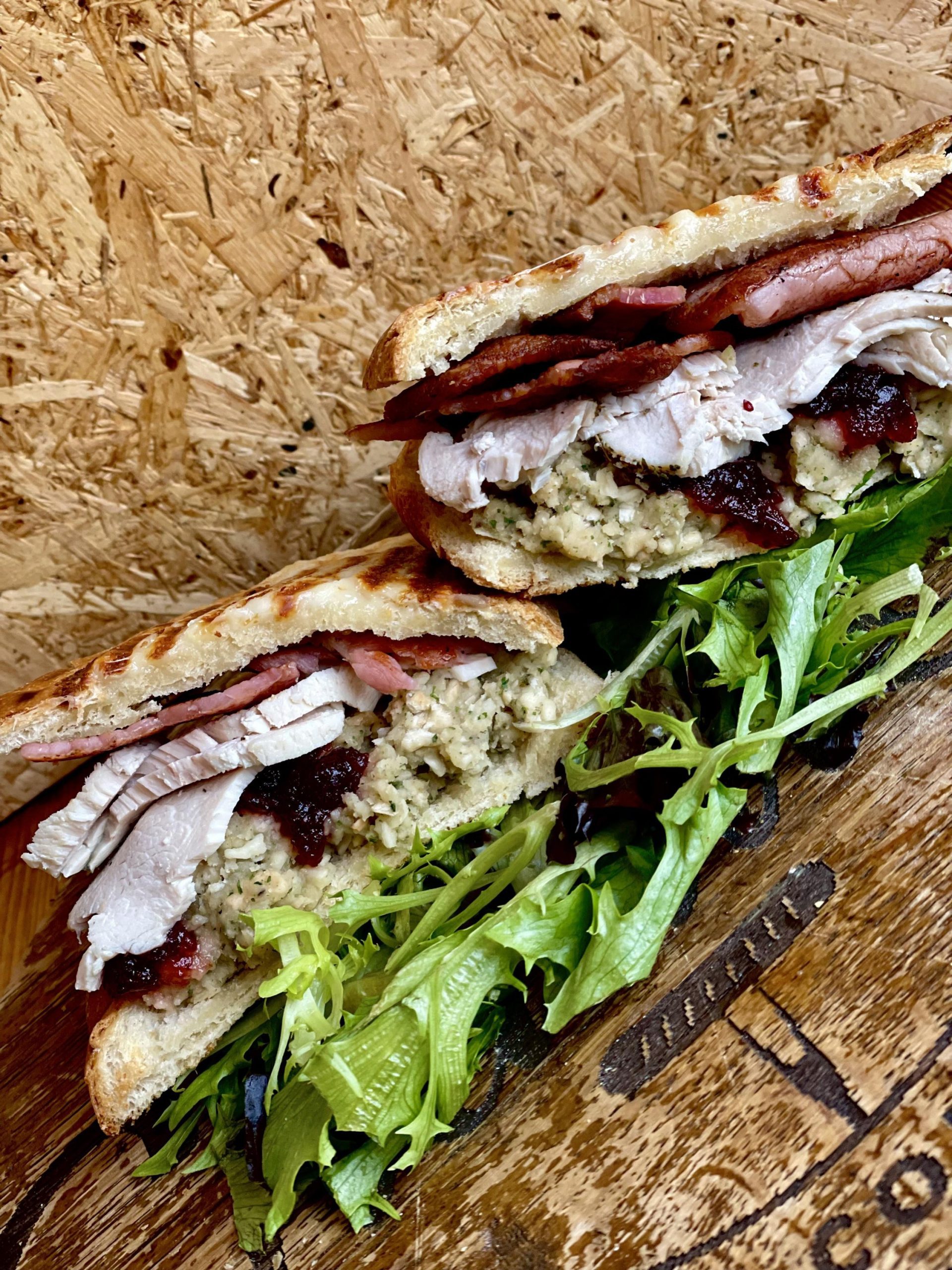 Chicken, stuffing, cheddar cheese & cranberry sauce toasted in our homemade bread.