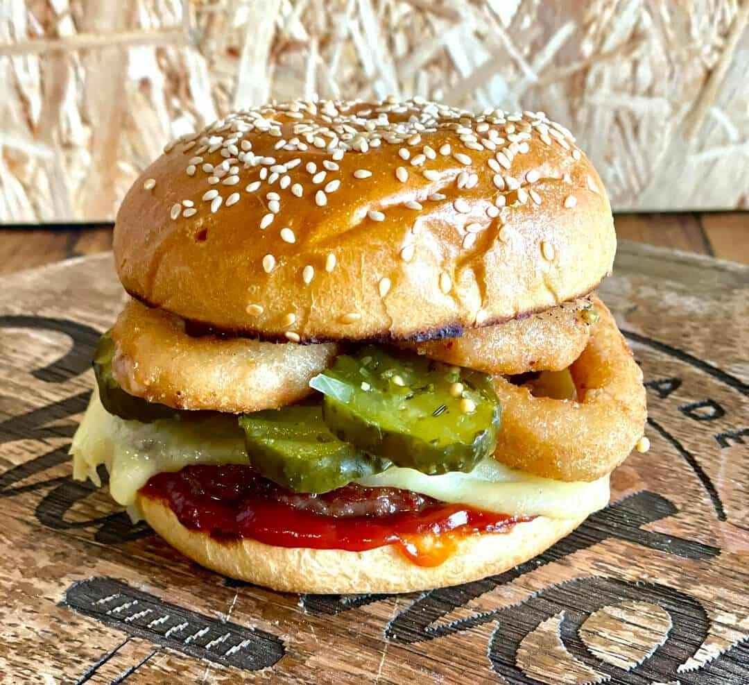 Butchers beef patty topped with melted mature cheddar cheese and onion rings on a bed of bbq sauce and pickles in a toasted brioche bun